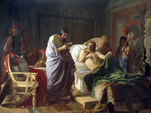 རྒྱལ་པོ་ཨ་ལིག་ཛན་ཌར་གྱིས་རྒྱལ་ཁམས་དུ་མ་མངའ་འོག་ཏུ་བསྡུས་རྗེས་ཕྱིར་རང་ཡུལ་དུ་ལོག་བཞིན་ཡོད། ལམ་བར་དུ་ཁོང་ལ་སྙུན་གཞི་བཞེས་ནས་འཆི་ཁར་ལྷུང་། འཆི་བདག་གི་གཤེད་མས་ཁོང་གི་ངོ་གདོང་ལ་ཅེར་ནས་ཡོད་པའི་སྐབས་དེར། ད་གཟོད་རྒྱལ་པོ་ཨ་ལིག་ཛན་ཌར་གྱིས་སོ་སོའི་དབང་སྒྱུར་གྱི་རྒྱལ་ཁ་དང་། སྟོབས་ཆེན་གྱི་དམག་དཔུང་། རྣོ་ངར་གྱི་རལ་གྲི། ད་རུང་རྒྱུ་དང་འབྱོར་བ་ཡོད་ཚད་ཅི་འདྲའི་དོན་སྙིང་དབེན་པ་རྟོགས། སྐབས་དེར་ཁོང་ལ་ཕ་ཡུལ་དུ་ལོག་སྟེ་ཨ་མའི་ཞལ་མཇལ་རྗེས། ཁོང་ལ་ཆེས་མཐའ་མའི་གྱེས་ཕྱག་འབུལ་བའི་འདུན་པ་དྲག་པོ་སྐྱེས་མོད། འོན་ཀྱང་ཇེ་ལུད་དུ་འགྲོ་བཞིན་པའི་སྙུན་གཞི་དེས་ཁོང་ཐག་རིང་གི་ཕ་ཡུལ་ལ་སླེབ་ཏུ་མི་འཇུག་པའི་གནས་སྟངས་དེ་ཁོང་གིས་དང་ལེན་མི་བྱེད་རང་བྱེད་རེད། དེ་བས་སྟོབས་དབང་གིས་ཕྱུག་པའི་རྒྱལ་པོ་ཁོང་ཞལ་མདོག་སྐྱ་བོར་གྱུར་ནས་ཉལ་ཡོད་ལ། རེ་ཟད་ངང་ཆེས་མཐའ་མའི་དབུགས་རྒྱུན་ཆད་རྒྱུར་བསྒུགས།